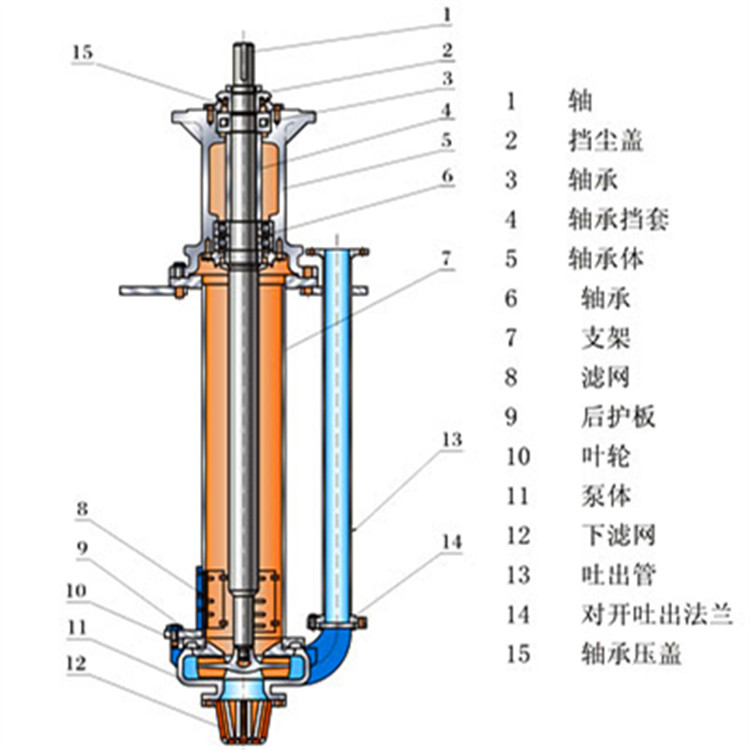 如圖所示為雙支撐液下渣漿泵典型結(jié)構(gòu),其結(jié)構(gòu)形式為立式,單殼體。